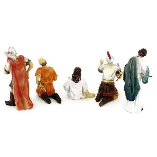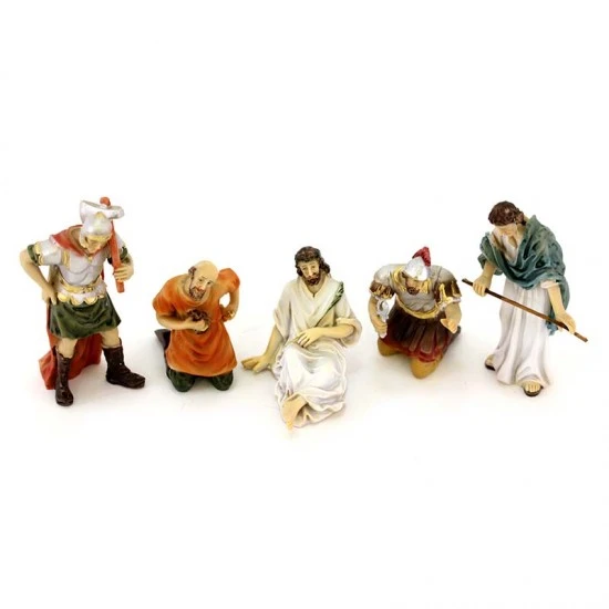 Scena raffigurante l’incoronazione di spine di Gesù, composta da 5 statuine realizzate interamente in resina colorata effetto legno. Prodotto di ottima fattura e ben rifinito, fornito confezionato in scatola di cartone.