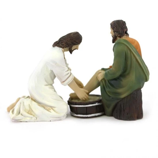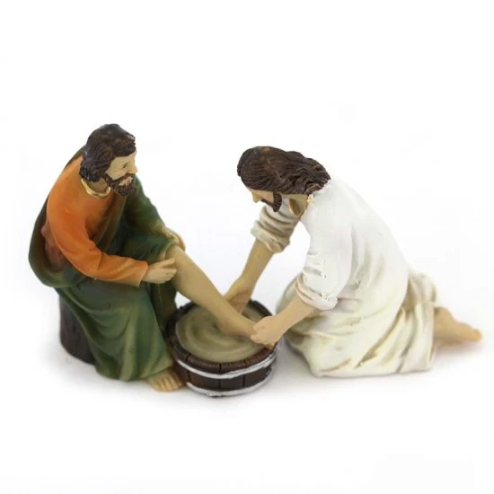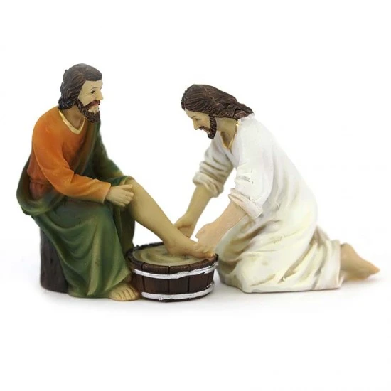 Scena vita di Gesù la Lavanda dei piedi, realizzata interamente in resina colorata. Prodotto di ottima fattura e ben rifinito, fornito confezionato in scatola di cartone.