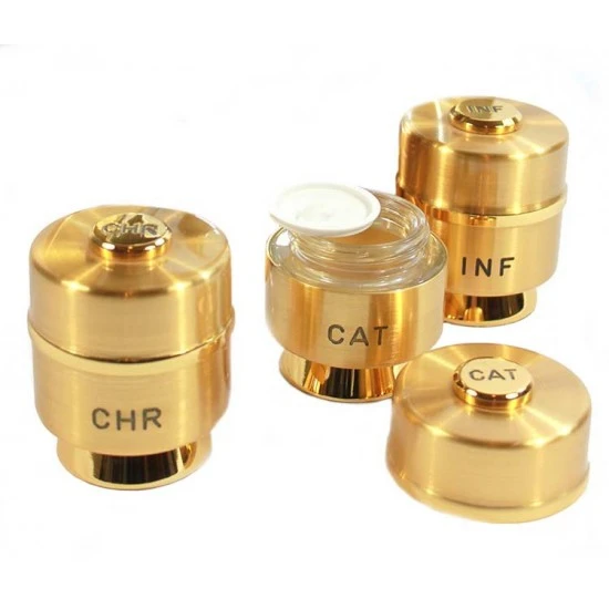 Servizio per oli Santi (Infermi, catecumeni, crisma) viene realizzato in ottone dorato con piattino tondo liscio con interno argentato completo di vasetti dorati satinati. Made in Italy