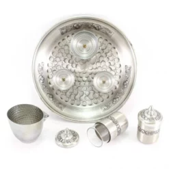 Servizio per oli Santi (catecumeni, crisma, infermi) realizzato in ottone liscio dorato, completo di vassoio con ferma vasetti. I tre vasetti sono muniti di interno in vetro. Il prodotto è fornito completo di astuccio. Made in Italy
