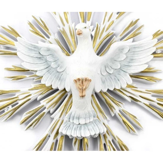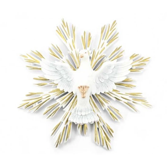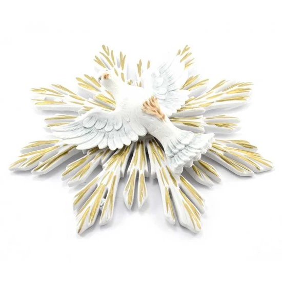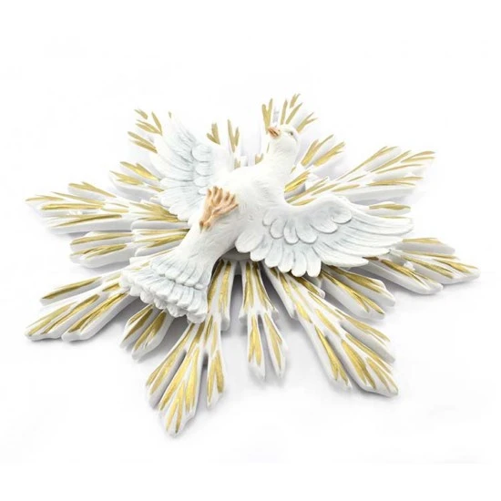 Spirito Santo realizzato interamente in resina colorata, impreziosito da una splendida raggiera ben rifinita. Quest’opera di pregevole fattura artigianale viene lavorata in un piccolo laboratorio dalla grande esperienza per le sculture sacre. Made in Italy