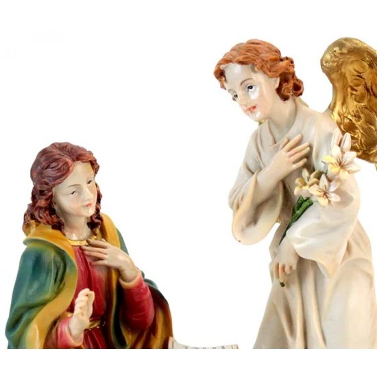 Statua Annunciazione dell’Angelo a Maria realizzata in resina colorata effetto legno. Confezionata in scatola di cartone litografato.
