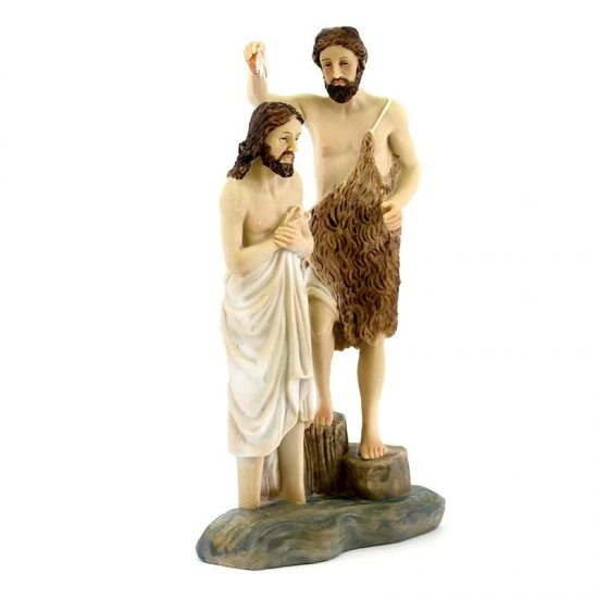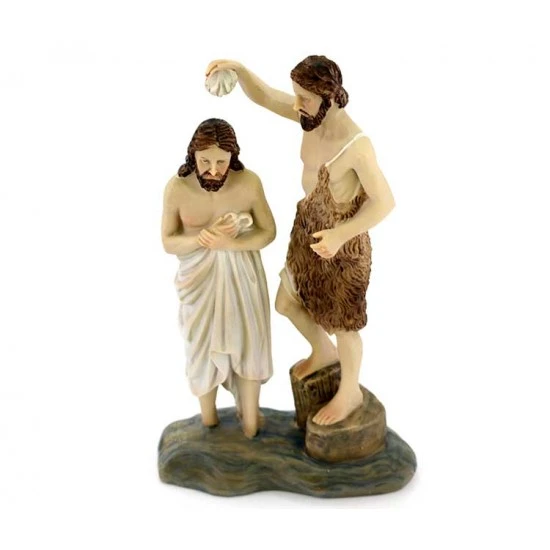 Battesimo di Gesù. Scena raffigurante il Battesimo di Gesù, realizzata interamente in resina colorata, composta da Gesù e San Giovanni Battista. L’articolo è fornito completo di scatola litografata.
