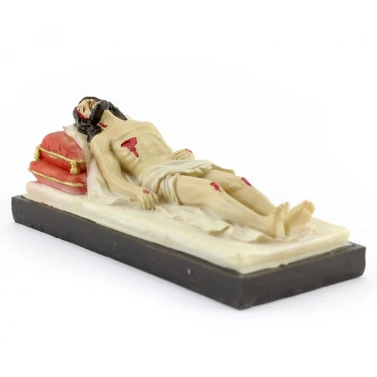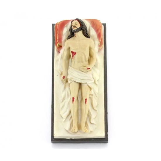 Statua Gesù Morto che giace sul lenzuolo, realizzata in resina colorata effetto legno completa di elegante scatola litografata.
