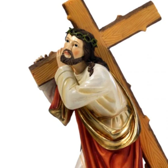 Splendida statua raffigurante Gesù con la croce in spalla, realizzata interamente in resina dipinta con colori molto tenui. Prodotto di ottima fattura e ben rifinito nei particolari fornito confezionato in scatola di cartone.
