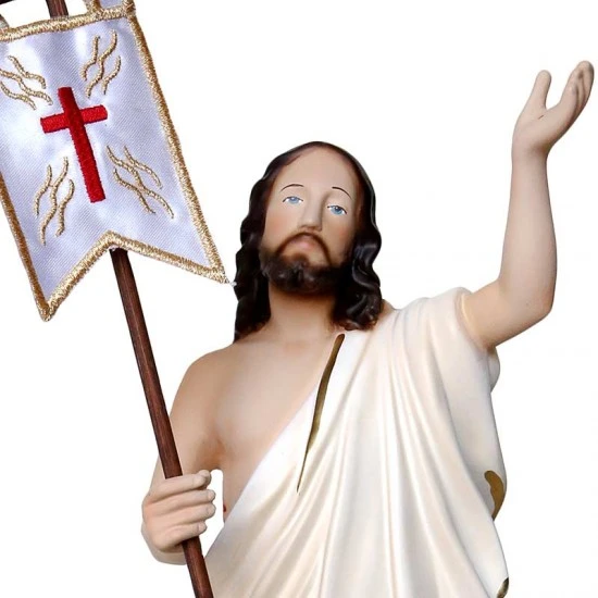 Statua Gesù Risorto con bandiera, realizzata interamente in resina dipinta a mano con colori indelebili. Produzione artigianale eseguita in un piccolo laboratorio dalla grande esperienza nella lavorazione di tutte le sculture sacre, questi artigiani curano ogni pezzo con la massima attenzione cura per i particolari al fine di rendere ogni opera unica ed originale. Made in Italy
