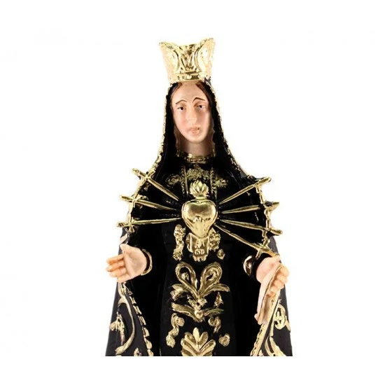 Statua Madonna Addolorata realizzata in resina piena dipinta a mano con colori indelebili. Lavorazione eseguita in un piccolo laboratorio artigianale con grande esperienza nella produzione di sculture sacre. Prodotto adatto anche per esterno. Made in Italy