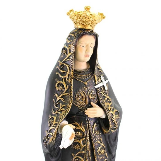 Statua Madonna Addolorata raffigurata su base dorata decorata, realizzata interamente in resina piena dipinta a mano con colori indelebili. Lavorazione eseguita in un piccolo laboratorio artigianale con grande esperienza nella produzione di sculture sacre. Prodotto adatto anche per esterno. Made in Italy