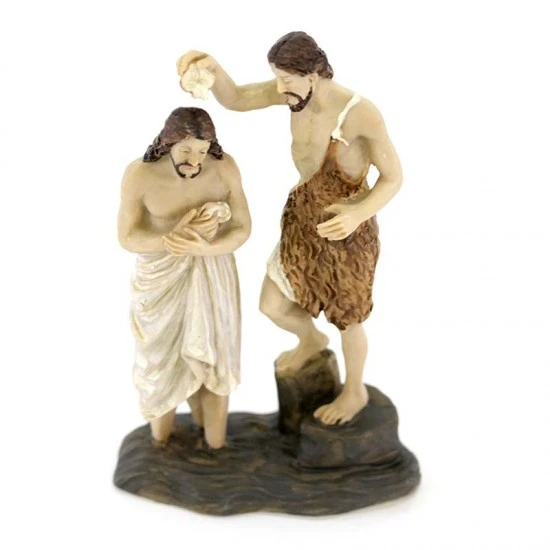 Statua scena raffigurante il battesimo di Gesù con San Giovanni Battista, realizzata interamente in resina colorata effetto legno. Prodotto di ottima fattura e ben rifinito, fornito confezionato in scatola di cartone.