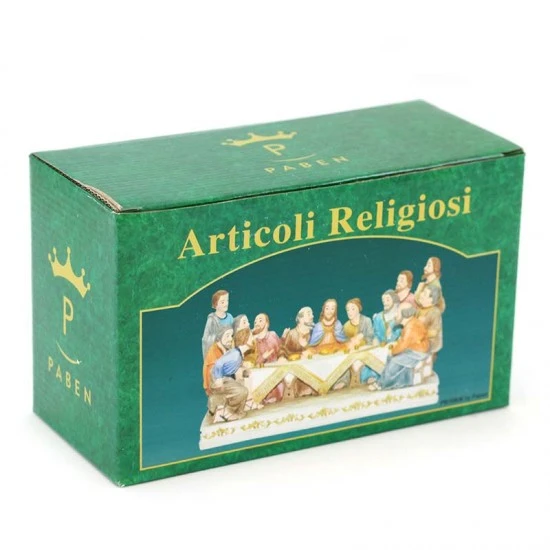 Splendida statua raffigurante l’Ultima Cena di Gesù con gli Apostoli realizzata interamente in resina colorata effetto legno. Prodotto di ottima fattura e ben rifinito fornito confezionato in scatola di cartone litografato.