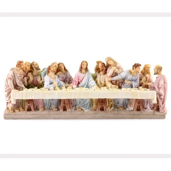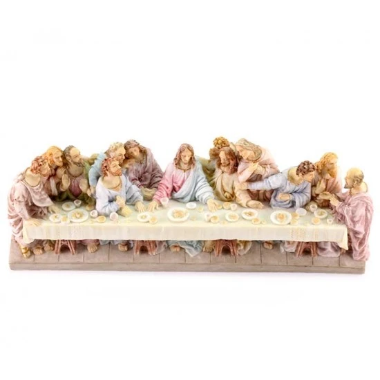 Statua Ultima Cena realizzata interamente in resina piena colorata con colori molto tenui. Prodotto importato di ottima fattura e ben rifinito nei particolari. La statua è ben confezionata e corredata di elegante scatola.