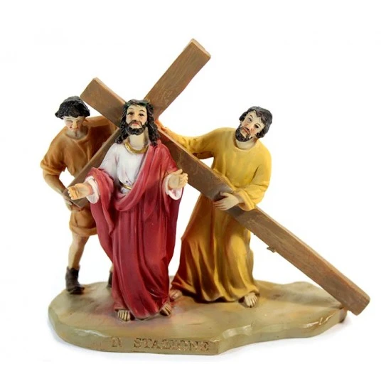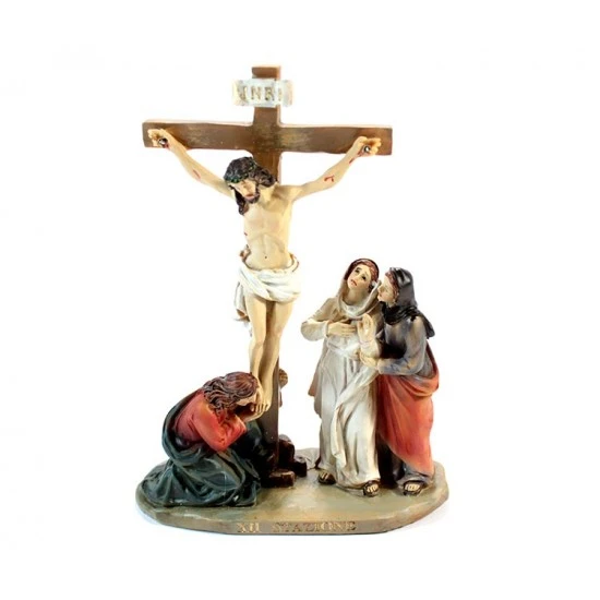 Via Crucis realizzata in singole stazioni. Particolare rappresentazione delle 14 stazioni della Via Crucis in resina colorata tipo legno. Ogni scena è fornita di scatolo singolo di cartone litografato.