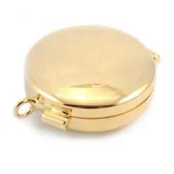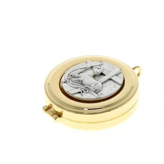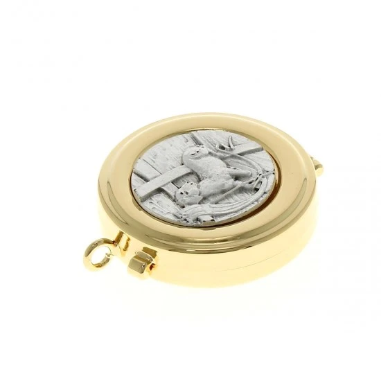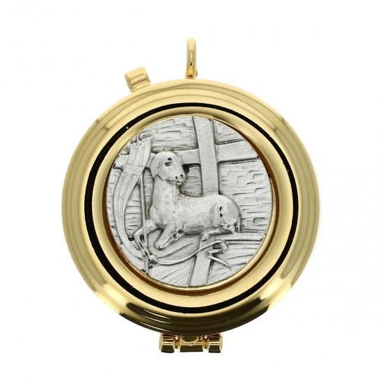 Teca eucaristica realizzata in metallo dorato con chiusura ad incastro e placca in peltro raffigurante simbolo eucaristico Agnello a rilievo. La teca è munita di anello per poterla indossare al collo. Made in Italy