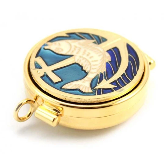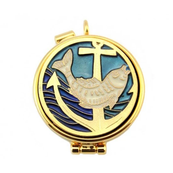 Teca eucaristica in metallo dorato con placca smaltata raffigurante un’ancora e un pesce. Made in Italy