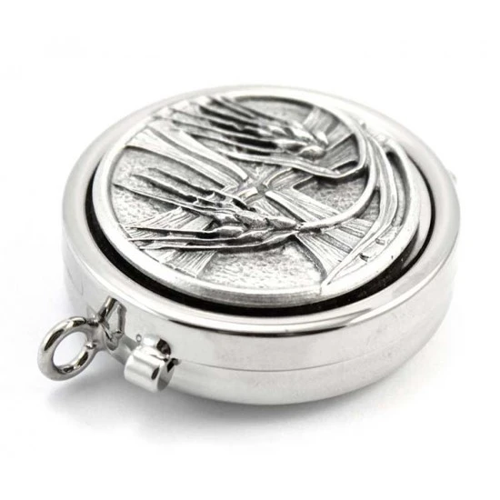 Teca eucaristica in metallo argentato con placca in peltro raffigurante una croce con le spighe. Il colore della teca è argentato perchè vi vanno riposte le particole per celiaci. Made in Italy