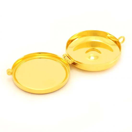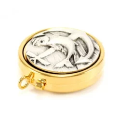 Teca eucaristica realizzata interamente in metallo dorato con chiusura ad incastro, impreziosita dalla placca smaltata e colorata con immagine raffigurante Gesù Buon Pastore. Made in Italy