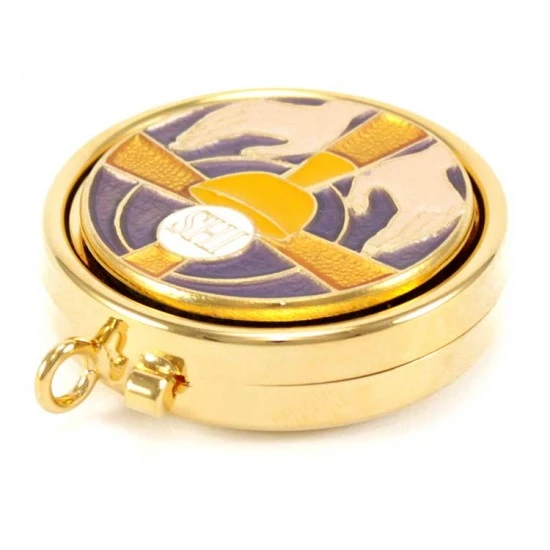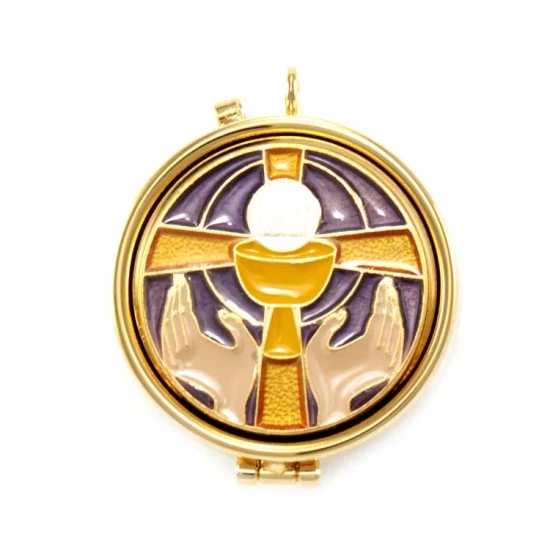 Teca eucaristica realizzata in metallo dorato con chiusura ad incastro. La placca smaltata raffigura la simbologia del calice tra le mani. Made in Italy