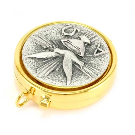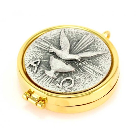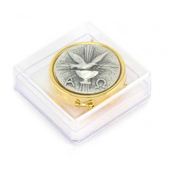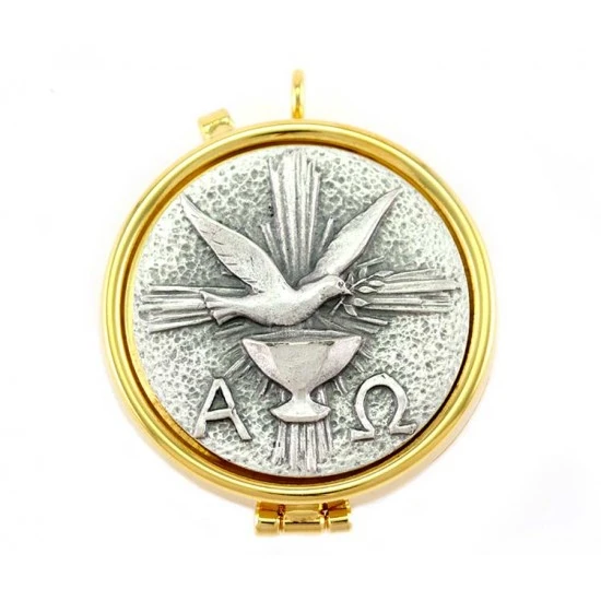 Teca eucaristica realizzata in metallo dorato con chiusura ad incastro. La placca argentata raffigura la simbologia liturgica della colomba, alfa e omega. Made in Italy