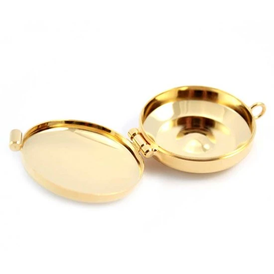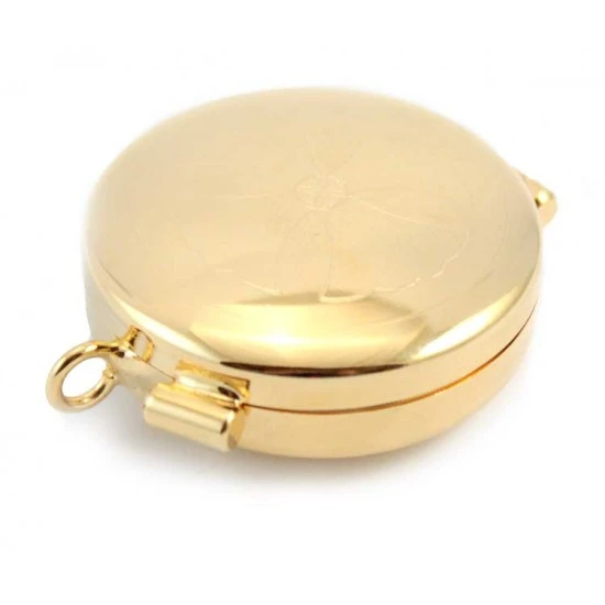 Teca eucaristica in metallo dorato con incisione sul coperchio di una croce quadrata. Made in Italy