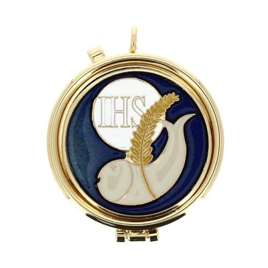 Teca eucaristica realizzata interamente in metallo dorato con chiusura ad incastro, impreziosita dalla placca smaltata e colorata raffigurante i simboli IHS e Pesce. Made in Italy