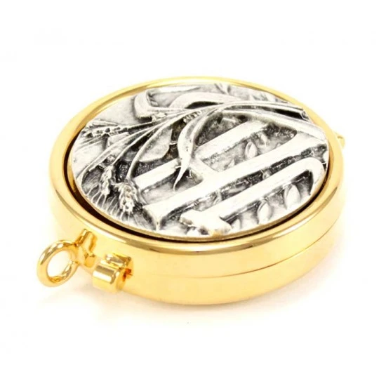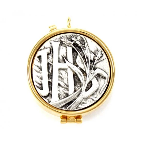 Teca eucaristica realizzata in metallo dorato con chiusura ad incastro. La placca argentata raffigura la simbologia liturgica dell’ Ihs con spiga di grano. Made in Italy