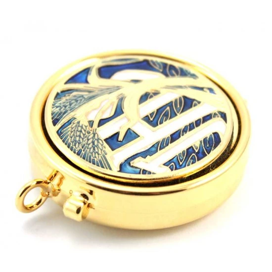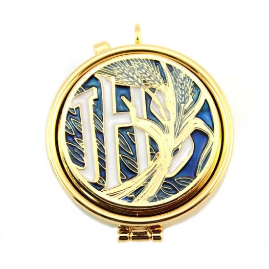 Teca eucaristica in metallo dorato con placca smaltata raffigurante le spighe di grano su una scritta IHS. Made in Italy