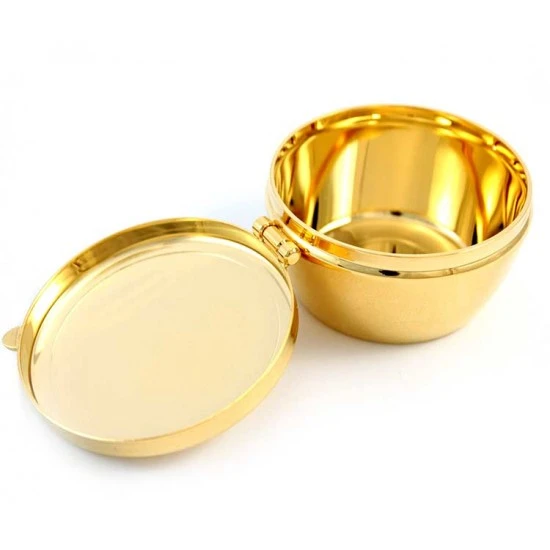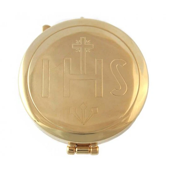 Teca eucaristica Alta in metallo dorato con incisione sul coperchio della simbologia liturgica dell’ Ihs. Made in Italy