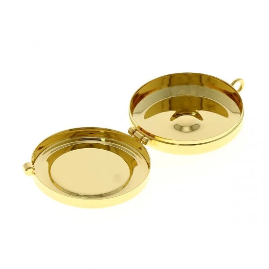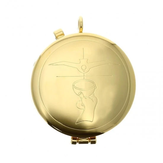 Teca eucaristica realizzata in metallo dorato con chiusura ad incastro e incisione raffigurante i simboli eucaristici del Calice e Colomba. La teca è munita di anello per poterla indossare al collo. Made in Italy