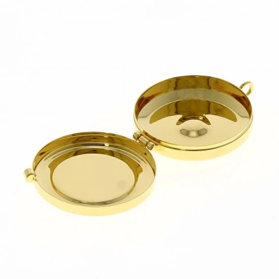 Teca eucaristica realizzata in metallo dorato con chiusura ad incastro e placca in peltro raffigurante simbolo eucaristici Mani e Pane a rilievo. La teca è munita di anello per poterla indossare al collo. Made in Italy