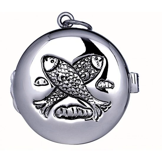 Teca eucaristica realizzata interamente in argento 800°° con la simbologia liturgica del pane e dei pesci che viene lavorata dai maestri argentieri con la tecnica del lavoro a sbalzo prima e del cesello poi, per dare maggior risalto alle rifiniture. Made in Italy