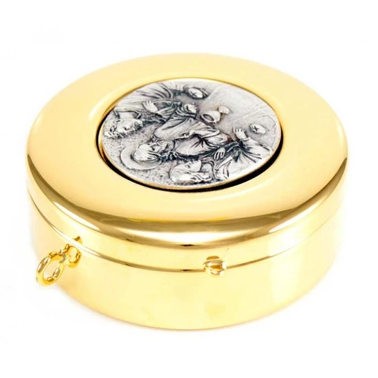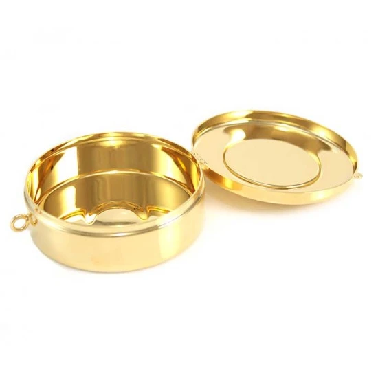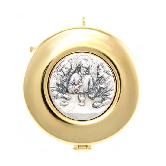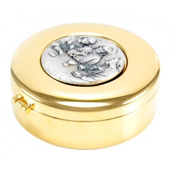 Teca eucaristica realizzata in metallo dorato con chiusura ad incastro. La placca argentata raffigura la simbologia liturgica dell’ Ultima Cena. Made in Italy