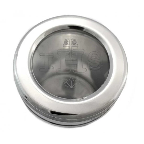 Teca per Ostie realizzata in alluminio argentato cromato e coperchio trasparente con incisione scritta IHS. Made in Italy
