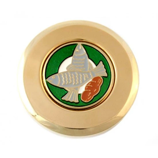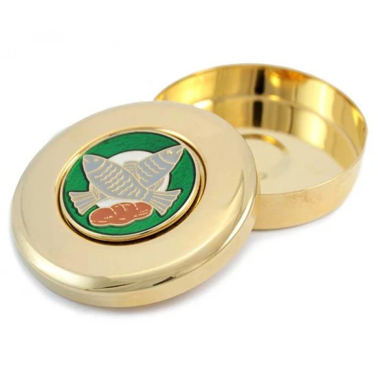 Teca per Ostie realizzata in metallo finitura dorata lucida con smalto colorato a fuoco raffigurante pane e pesci sul coperchio. Made in Italy