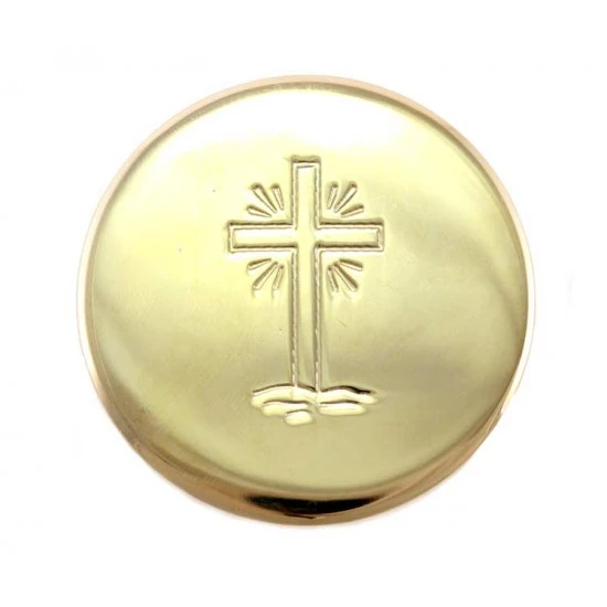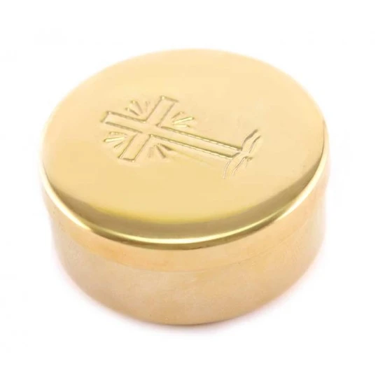Teca porta ostie in metallo dorato con Croce incisa sul coperchio.