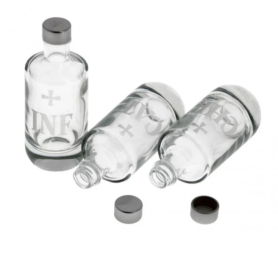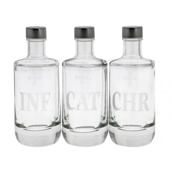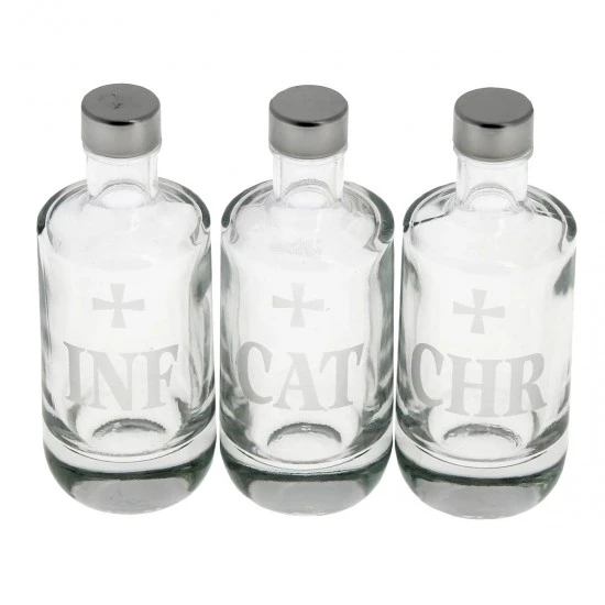 Bottigliette per olii Santi (Infermi, Chrisma e Catecumeni) realizzate in cristallo con sigla incisa, munite di tappi argentati. Prodotto realizzato con la massima cura per i particolari spedito in scatola di cartone con imballaggio sicuro per il trasporto. Made in Italy