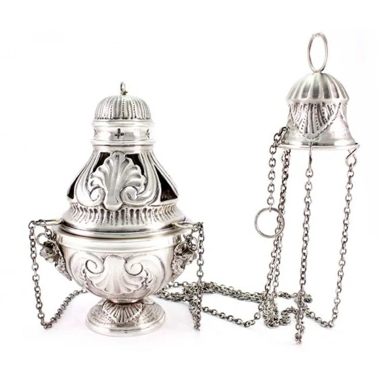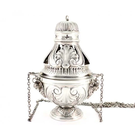 Turibolo con navetta in ottone stile barocco completamente cesellato a mano, realizzati in ottone argentato ossidato. La lavorazione degli ornati viene eseguita con la tecnica del cesello a mano da artigiani specializzati. Il turibolo è corredato di fornello interno estraibile cosi da consentirne l’eventuale sostituzione. La navetta viene fornita con cucchiaino per l’incenso. Made in Italy