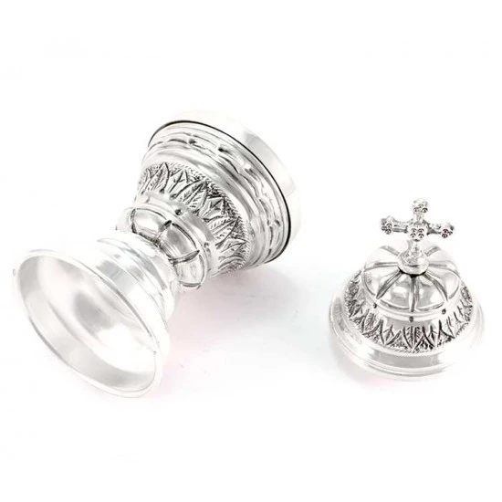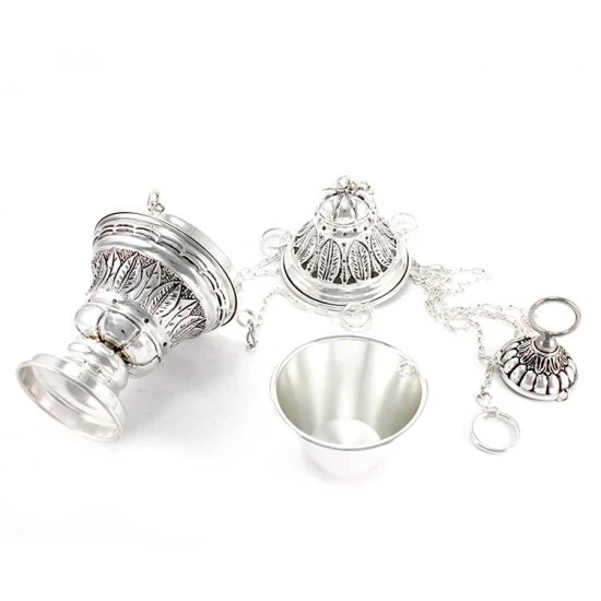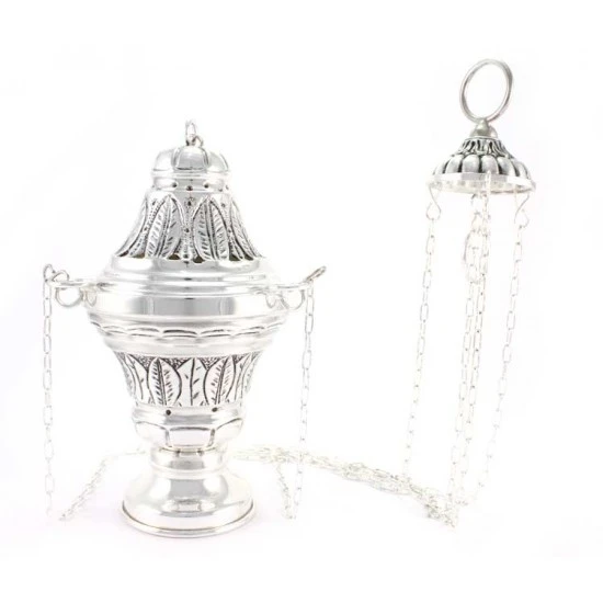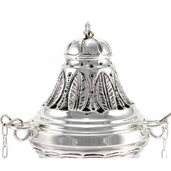 Turibolo con Navetta realizzato in ottone argentato con lavorazione dei fregi eseguita accuratamente a cesello. Particolarmente solenne e ricco su questo turibolo sono raffigurate delle foglie di ulivo lavorate nei minimi dettagli. La lavorazione degli ornati e dei fregi presenti vengono eseguiti con la tecnica del cesello a mano da artigiani che prestano la massima attenzione per le rifiniture dei particolari. Il bagno argentato viene eseguito con micron ad alto spessore che consente di preservare il prodotto nel tempo. Il turibolo è corredato di fornello interno estraibile cosi da consentirne l’eventuale sostituzione. Fornito completo di navetta in stile analogo. Made in Italy