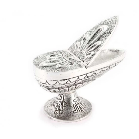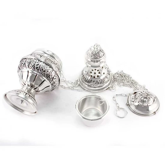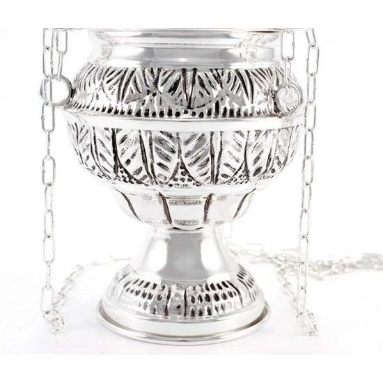 Turibolo con Navetta realizzato in ottone argentato con lavorazione dei fregi eseguita accuratamente a cesello da artigiani che prestano la massima attenzione per le rifiniture dei particolari. Il bagno argentato viene eseguito con micron ad alto spessore che consente di preservare il prodotto nel tempo. Il turibolo è corredato di fornello interno estraibile cosi da consentirne l’eventuale sostituzione ed è fornito completo di navetta in stile analogo. Made in Italy