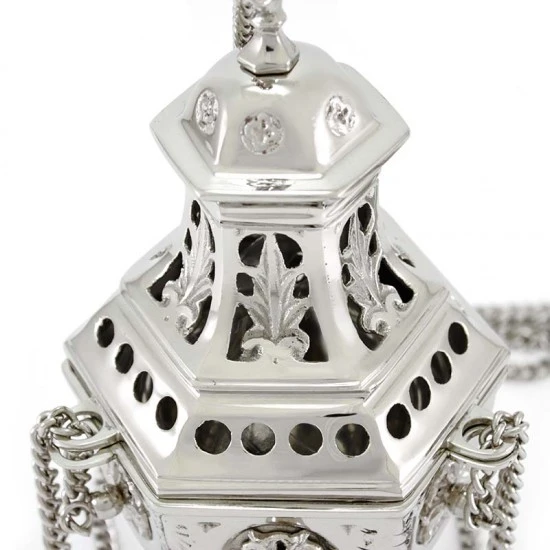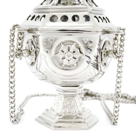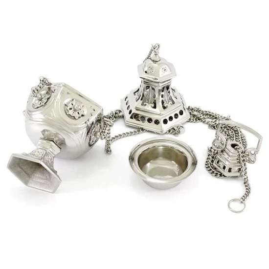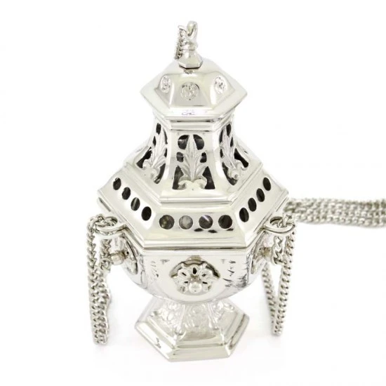 Turibolo con forma esagonale realizzato in metallo pesante nichelato con base decorata. Fornito completo di catene e fornello interno nella quale si inserisce il carbone e l’incenso da ardere. Sul coperchio sono presenti diverse feritoie che oltre a renderlo solenne servono per la fuoriuscita del profumo. Prodotto di ottima fattura e ben rifinito nei particolari confezionato in scatola di cartone.