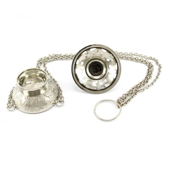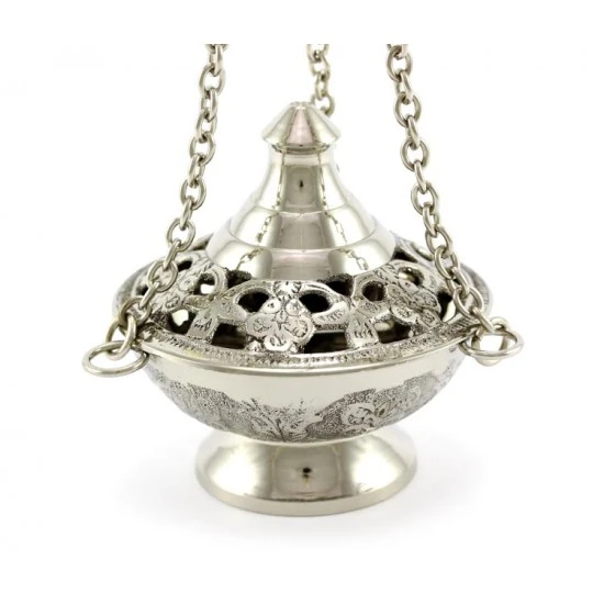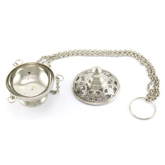 Turibolo Fiorato piccolo realizzato in ottone argentato, modello classico con catene. Questo prodotto nonostante le piccole dimensioni viene curato nei particolari e si presenta elegante oltre ad essere molto funzionale. Il coperchio presenta diversi fori che oltre ad impreziosire l’estetica del prodotto servono per la fuoriuscita del profumo. Prodotto di importazione di ottima qualità.