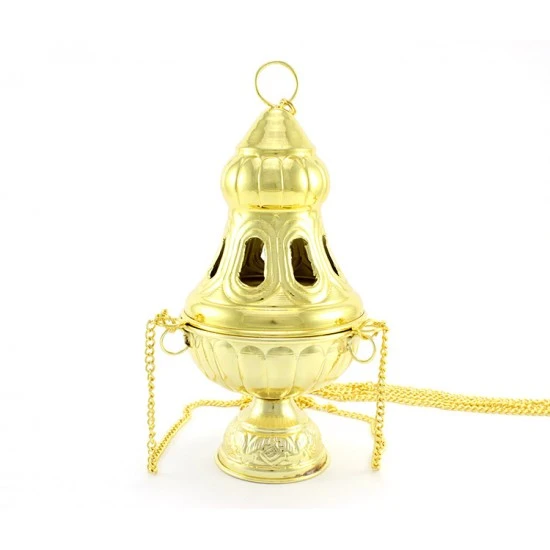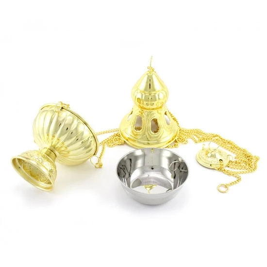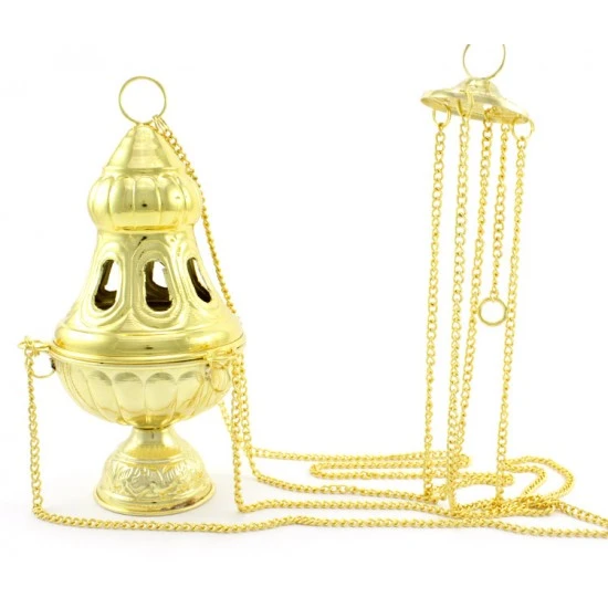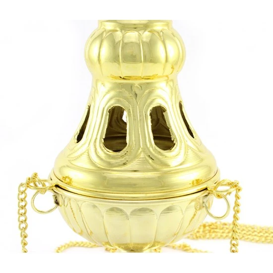 Turibolo Forato realizzato in ottone dorato e fornito completo di fornello interno nella quale si inerisce il carbone e l’incenso da ardere. Modello in stile barocco completo di catene ,sul coperchio sono presenti diversi fori che oltre a renderlo solenne servono per la fuoriuscita del profumo. Prodotto di importazione di ottima qualità.