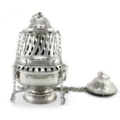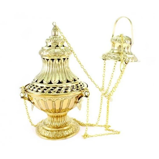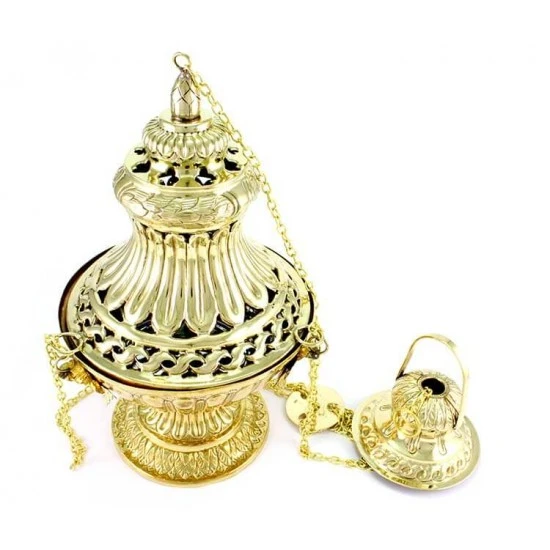 Turibolo grande traforato realizzato in metallo dorato con base lavorata. Fornito completo di catene e fornello interno nella quale si inserisce il carbone e l’incenso da ardere. Sul coperchio sono presenti diverse feritoie che oltre a renderlo solenne servono per la fuoriuscita del profumo. Prodotto di importazione di ottima qualità.