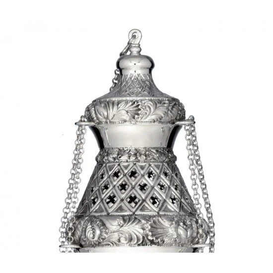 Turibolo modello grande. Quest’opera artigianale viene realizzata interamente in argento 800°°. Lavoro accuratamente eseguito dai maestri argentieri che per donare solennità e pregio al pezzo utilizzano la tecnica dello sbalzo a mano, successivamente tutte le rifiniture vengono perfezionate attraverso gli interventi di cesello. Viene fornito completo di custodia. Made in Italy