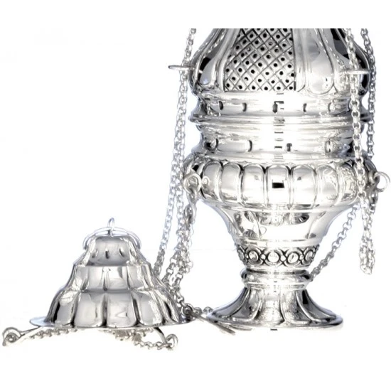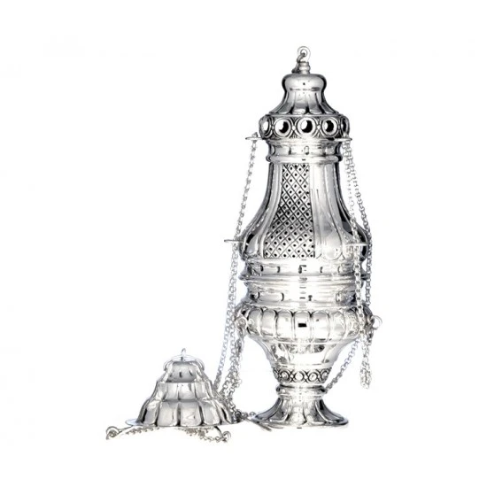 Turibolo modello fresoni. Questa grandiosa opera artigianale viene realizzata interamente in argento 800°°. Lavoro accuratamente eseguito dai maestri argentieri che per donare solennità e pregio al pezzo utilizzano la tecnica dello sbalzo a mano, successivamente tutte le rifiniture vengono perfezionate attraverso gli interventi di cesello. Viene fornito completo di custodia. Made in Italy
