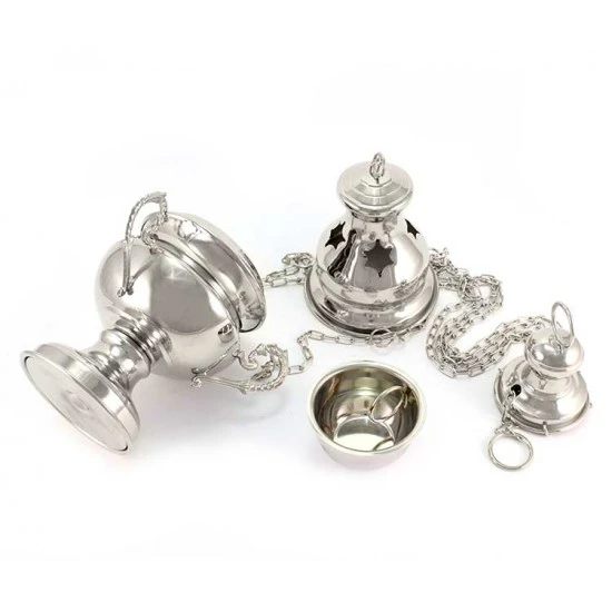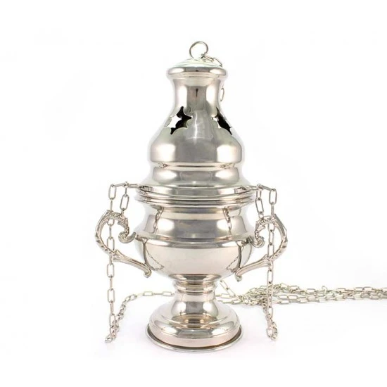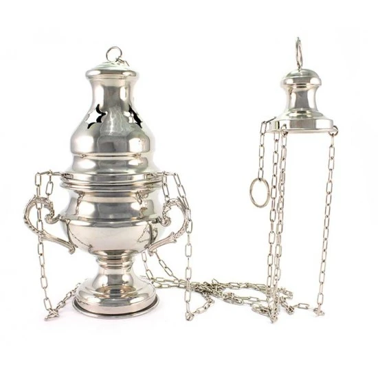 Turibolo liscio realizzato in metallo argentato. Fornito completo di catene e fornello interno nella quale si inserisce il carbone e l’incenso da ardere. Sul coperchio sono presenti diverse feritoie che oltre a renderlo solenne servono per la fuoriuscita del profumo. Prodotto di importazione di ottima qualità.