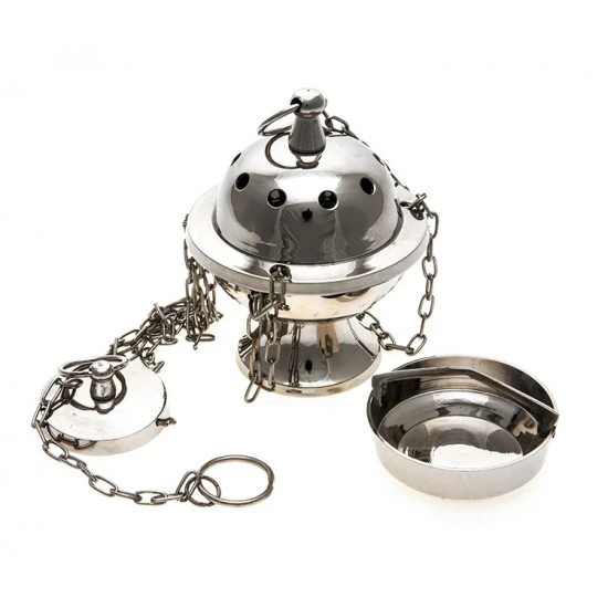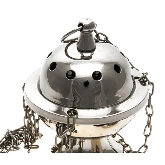 Turibolo a sfera realizzato in ottone argentato completo di fornello interno e catene. Questo prodotto nonostante le piccole dimensioni è molto elegante e funzionale. Made in Italy
