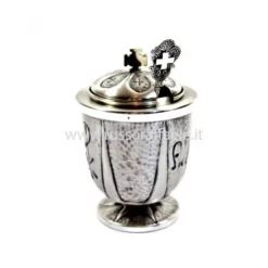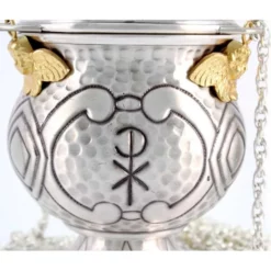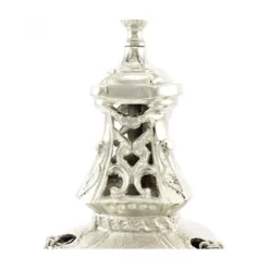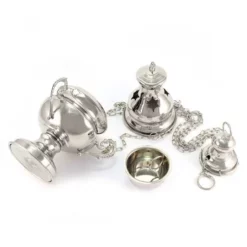 Turibolo Traforato realizzato in ottone argentato con piccola crocetta superiore. Fornito completo di fornello interno nella quale si inerisce il carbone e l’incenso da ardere. Modello classico completo di catene. Il coperchio presenta diversi fori che oltre ad impreziosire l’estetica del prodotto servono per la fuoriuscita del profumo. Prodotto di importazione di ottima qualità.