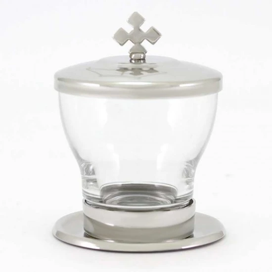 Vasetto per olio Santo Crisma realizzato in vetro e metallo nichelato munito di coperchio con scritta incisa. Prodotto di ottima fattura e ben rifinito. Made in Italy