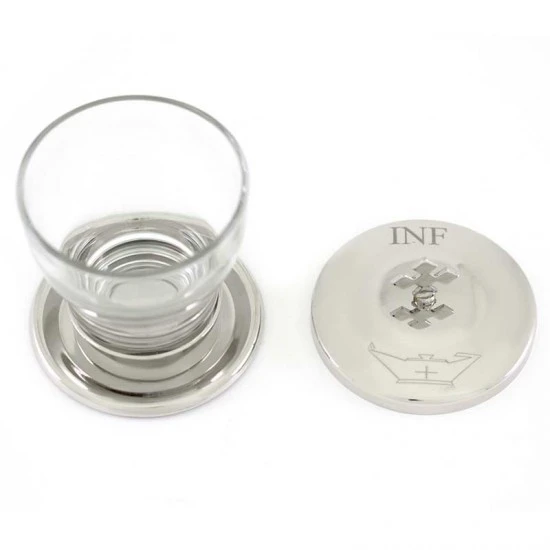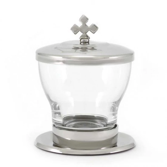 Vasetto per olio Santo Infermi realizzato in vetro e metallo nichelato munito di coperchio con scritta incisa. Prodotto di ottima fattura e ben rifinito. Made in Italy