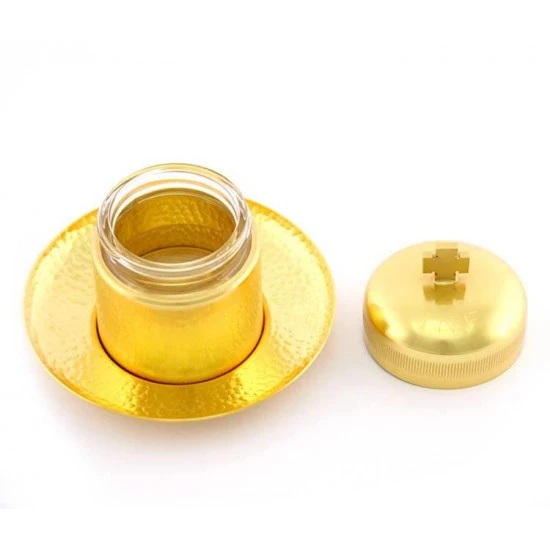 Vasetto per olio Santo Infermi realizzato in metallo dorato martellato con piattino inglobato e interno in vetro. Sistema di apertura sicuro e pratico con filettatura, svita e avvita. Made in Italy